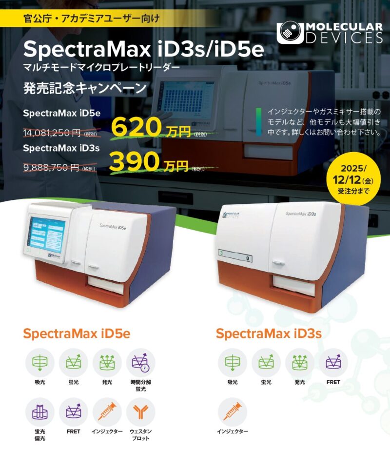 新製品のSpectraMax iD5e・iD3eをいきなり、半額以下の特別価格でご提供します。また、パーソナルモデルのSpecreaMax Miniも特別価格でご提供します。詳しくはコチラ。