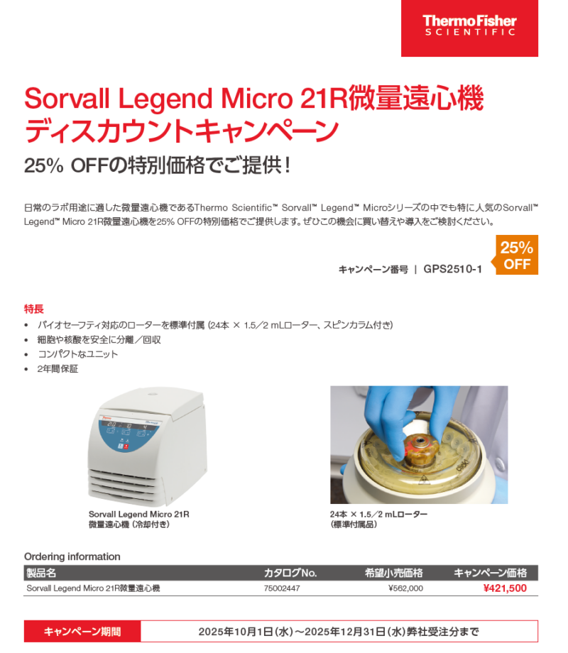 サーモフィッシャーサイエンティフィック 微量遠心機ディスカウントキャンペーン開催 ~2025年12月31日まで
