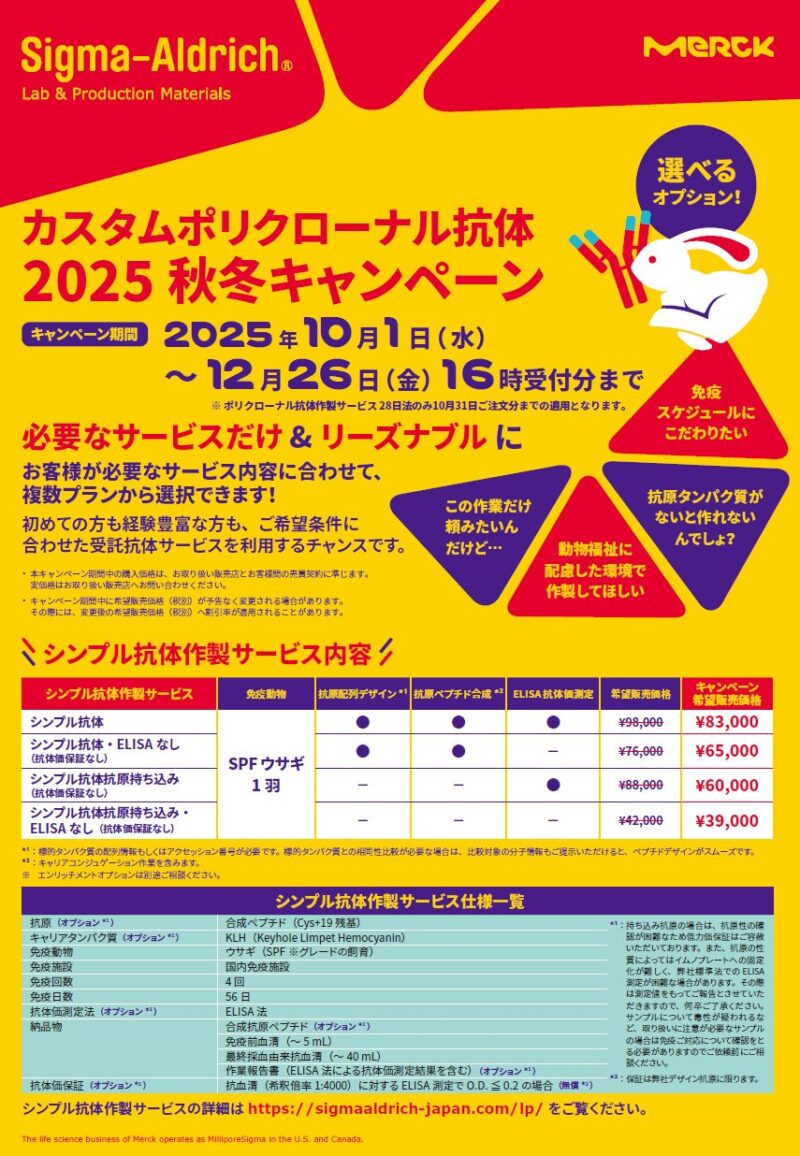メルク(SigmaArdrich)カスタムポリクローナる抗体キャンペーン開催開催期間:2025年10月1日~2025年12月26日(PM4:00)まで