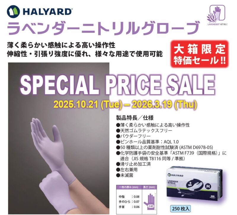 みなさまご愛用のラベンダーニトリルグローブを大箱限定、特別価格でご提供します。詳しくはコチラ。