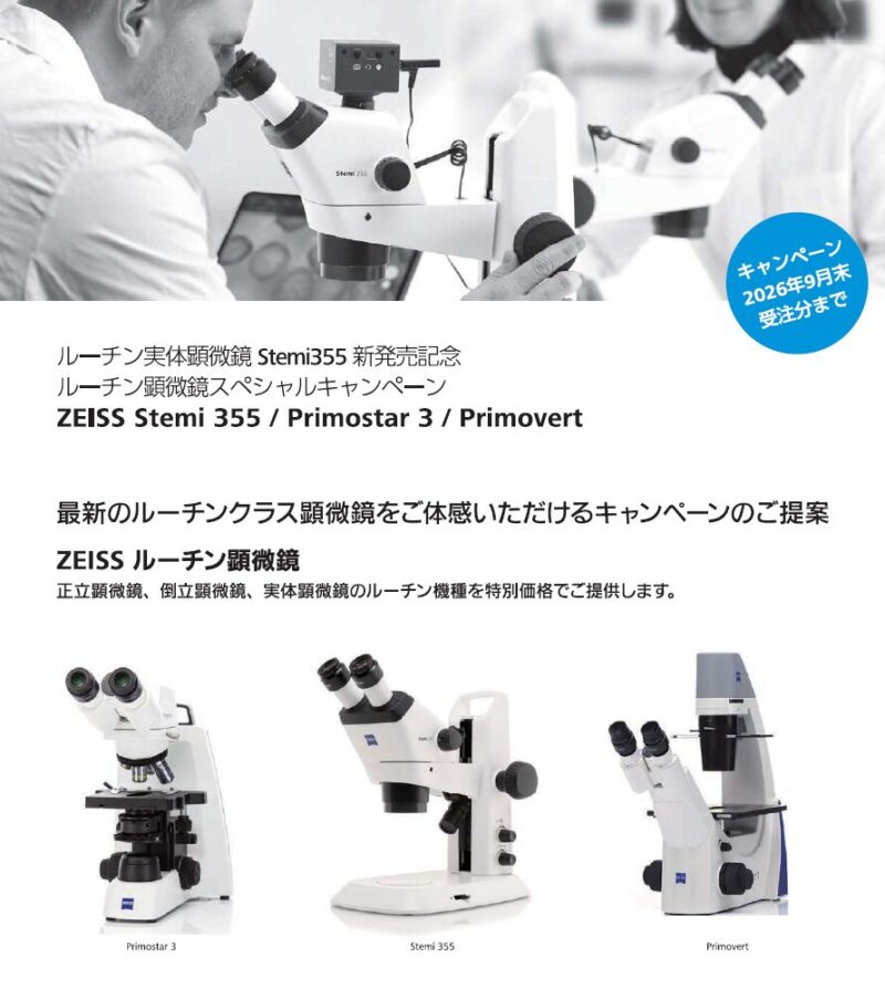 新製品のルーチン型顕微鏡Stemi355をいきなり特別価格でご提供。そのほか正立顕微鏡・倒立顕微鏡もスペシャルパッケージでご提供します。詳しくはコチラ。