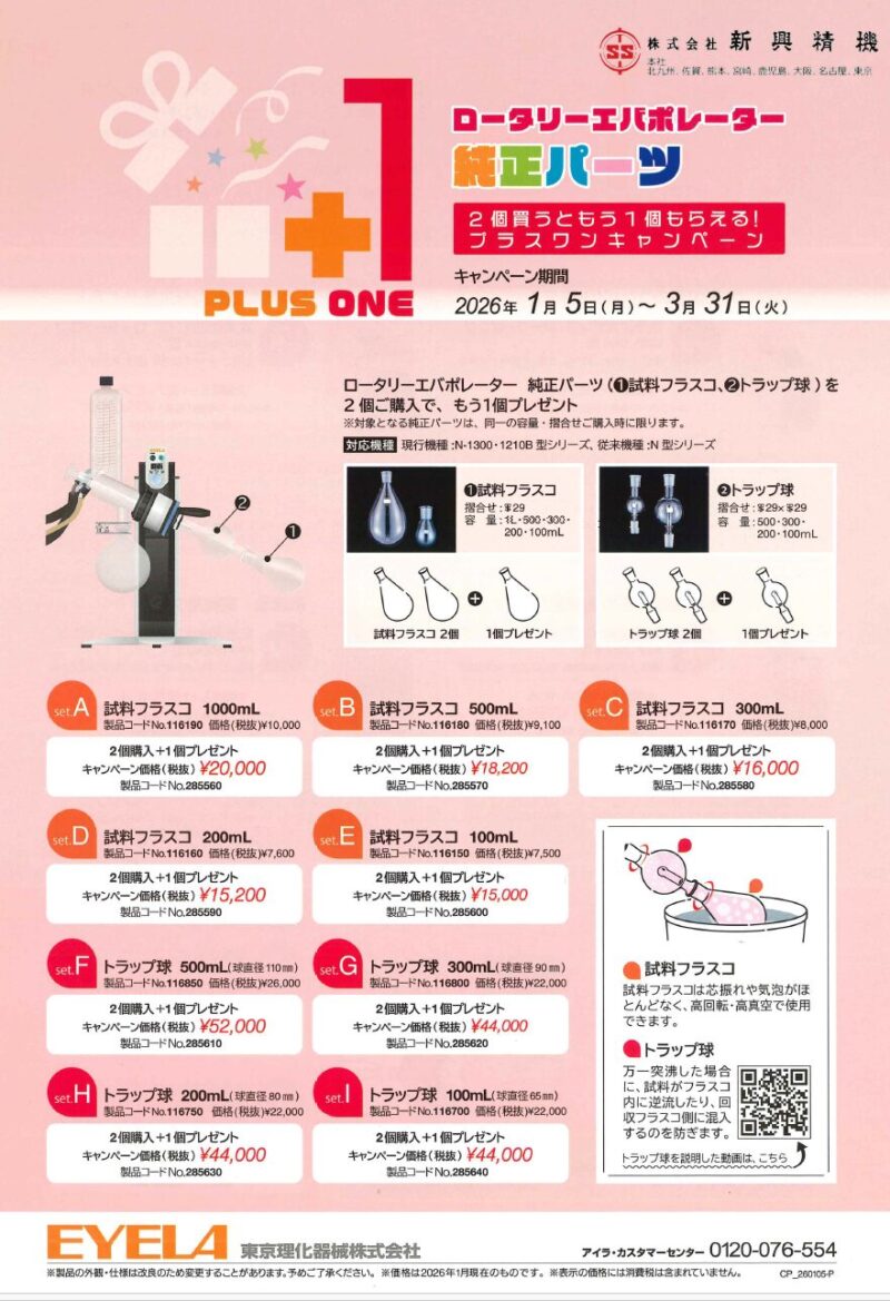 ロータリーエバポレーター純正パーツを2個購入で1個プレゼント。この期間に是非ともご検討下さい。詳しくはコチラ。