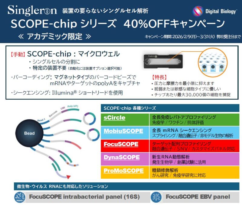 アカデミック限定 Singleron SCOPEーchip シリーズ 40%OFFキャンペーン開催 開催期間:2026年2月9日~2026年3月31日まで