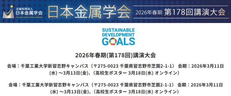日本金属学会2026 第178回講演大会開催期間: 2026年3月11日(水)~13日(金)9:00-17:00 *13日は13:00まで 会場:千葉工業大学